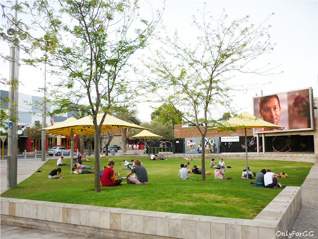 黄昏时分,太阳已缓缓落下,夕阳斜照在一旁的小池和绿色草皮。向往着那份坐在草坪上的悠闲,我们便坐着休息闲聊了一会儿,但上班族正来来往往赶着回家,让我觉得怪不好意思!